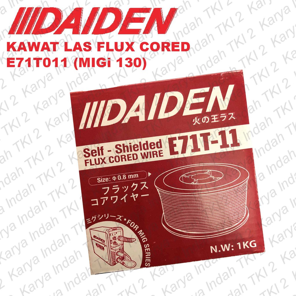 DAIDEN FLUX CORED WIRED1 KG (ET71T-11)Kawat Las mesin MIG Flux Core Tanpa perlu gas CO dari DAIDEN. Digunakan untuk mesin Daiden MIGi 130.Spesifikasi :Tipe: ET711-11Ukuran : 0.8mmUntuk Las : BesiDAIDENMESIN LAS MIGi130 :https://shopee.co.id/product/77360429/180311