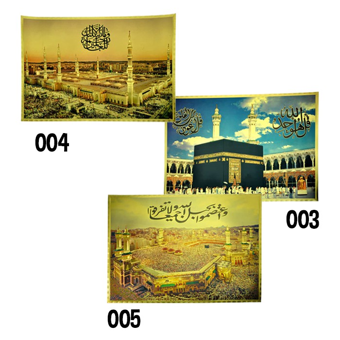 Kaligrafi Lembaran Makah, Masjid Nabawi dan Masjidil Haram Ukuran 35x50cmKaligrafi lembaran berbahan sejenis alumunium foil yang mengkilap dan tebal, cocok langsung di tempel di tembok atau dipasang menggunakan bingkai. Siap menjadi pusat perhatian dan dekorasi unik di rumah A