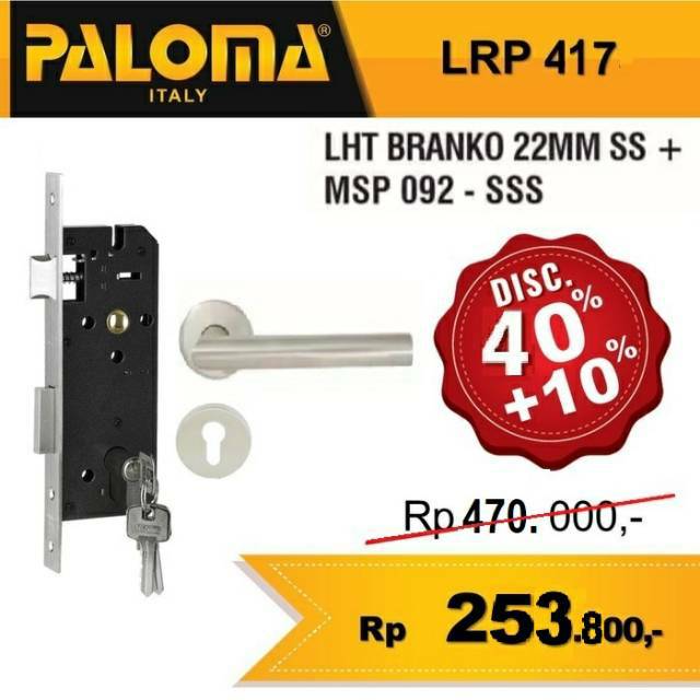 LRP 417LOCKSET ROSES PALOMA LHT BRANKO 22MM SS + MSP 092 SSSFeatures & Specification:- Material handle: Stainless steel, tahan karat dan korosi.- Material mortise lock: Stainless steel, tahan karat dan korosi.- Material cylinder: Brass (kuningan), nickel plated.- Ukuran backset 40 mm.- Ukuran C-C (lubang as handle ke lubang as cylinder) 85 mm.- Garansi mekanikal selama 5 tahun.Backset 40mmMOHON KESEDIAAN BAPAK/IBU COSTUMER AGAR MELAKUKAN KONFIRMASI TERLEBIH DAHULU, APAKAH STOCK TERSEDIA ATAU TIDAK DI KOLOM DISKUSI / MESSAGE. DEMI KELANCARAN PROSES PESANAN.TERIMA