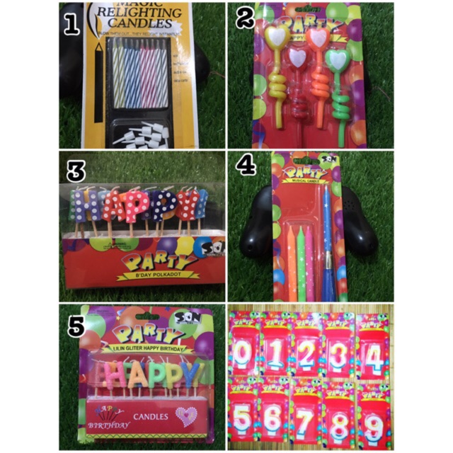 1. Magic relighting candles2. Lilin love3. Lilin hbd polkadot4. Lilin musical candle5. Lilin hbd glitter6. Lilin